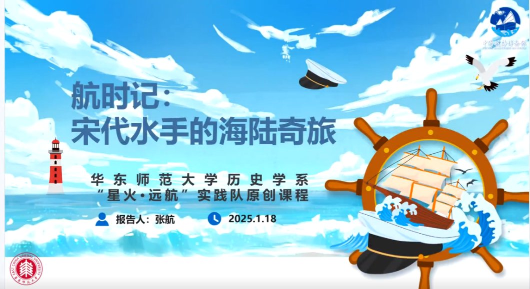 23级本科生张航展示了《航时记:宋代水手的海陆奇旅》,这是与中国航海博物馆共同建设“星火·远航”项目的原创课程。课程依托学科优势和博物馆资源,以宋代海上丝绸之路为背景,围绕宋代水手的生活、技能和知识需求展开。通过电影片段、文学作品和历史遗迹展示,结合“南海一号”沉船考古发现,拓宽学生视野。教学采用小型航海知识竞赛和教学评一体化方式,评估学生掌握情况,并培养家国情怀和人文关怀。