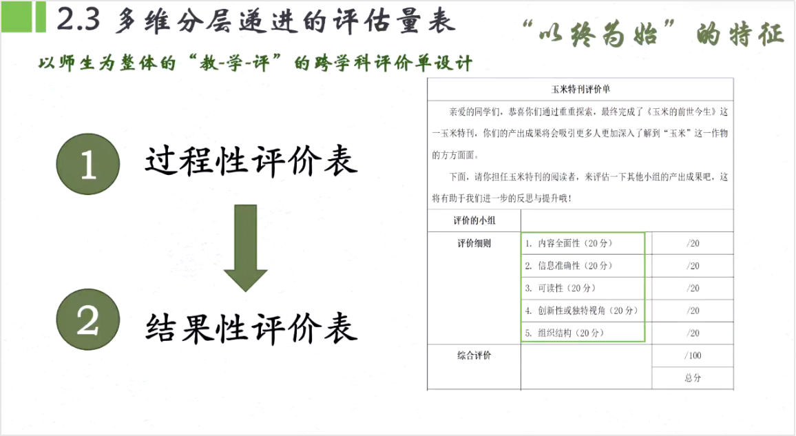陆老师结合自己《静说历史》课程的教学经历,总结了跨学科活动设计的收获,提出跨学科学习的主题应遵循 “自上而下、自下而上、勾连古今” 原则,并分享了与不同学科教师之间的对话有利于发现学科融合点、帮助学生形成综合理解的体验。通过分享评价量表,强调“评价即学习”,并提出跨学科作业的创新思路。