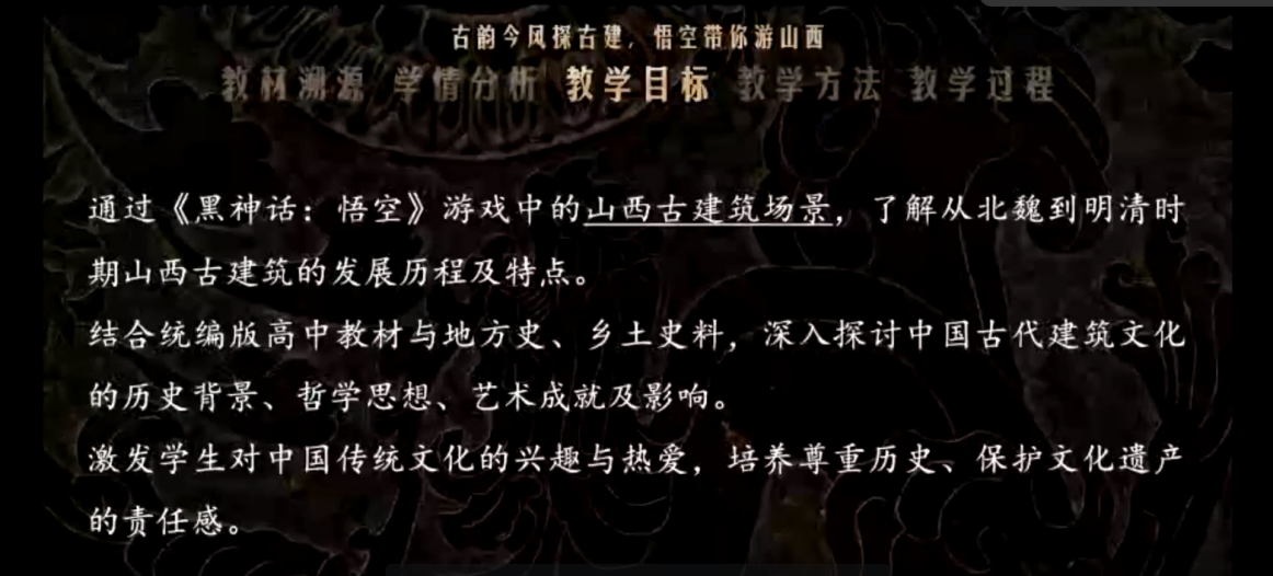 21级师范生李鸿平同学跟大家分享校本课程《〈黑神话:悟空〉里的历史课》的设计。以《黑神话:悟空》游戏中的山西古建筑场景为依托,结合北魏到明清时期山西古建筑信息,对高中历史教材相关内容进行溯源,并构建课程架构。旨在通过介绍山西古建筑的历史背景、文化内涵和艺术特色,培养学生文化自信和民族自豪感。教学以游戏场景为切入点,采用讲授法、问题教学法和小组合作法,并结合3D建模展示古建筑细节。课程预计安排十课时。