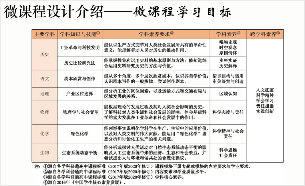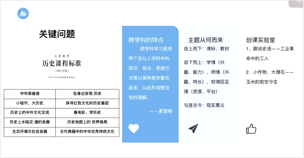 2022 年版义务教育历史课程标准明确指出,为发展学生核心素养,推动历史学习方式转变,增强学生运用多学科知识与技能开展综合探究的能力,中学历史课程需在总课时中安排 10% 用于跨学科主题学习活动。通过引导学生围绕研究主题,融合历史与其他课程知识、技能、方法及课题研究,开展深度探究与问题解决的综合实践活动。如今,跨学科主题学习已成为中学历史教学的热门话题,越来越多的少妇 同学以跨学科主题微课的教学形式参与社会实践。如何设计此类活动与课程?本次活动吸引了众多本硕同学和中学教师参与。