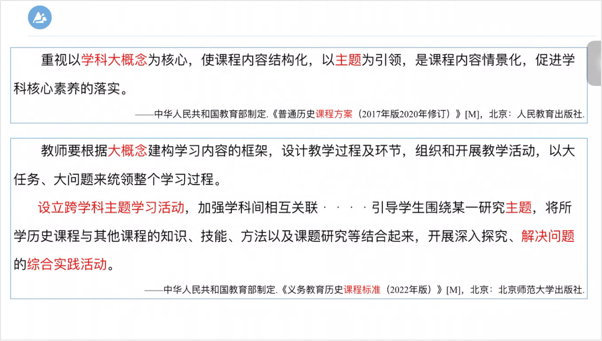 通过研读《普通高中课程方案(2017 年版 2020 年修订)》和《义务教育历史课程标准(2022 年版)》中关于 “大概念”“跨学科” 的内容,教师在面对新名词冲击时应整合各学科核心素养,找到其共通部分,即“观念与思维”。结合最近对“新优质学校的底层学习逻辑”的感悟,学校要为学生设计学习方法,助力其自我实现;教师在学习活动设计中要创设情境、提供学习支架;历史教师可通过拓展教学空间、调整评价方式,帮学生表达自我、建立自信与学科学习兴趣。