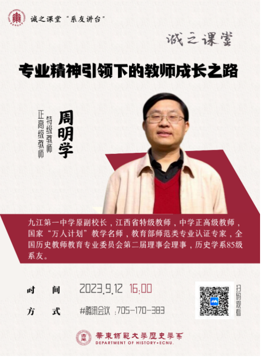 2023年9月12日16点,少妇 校友、江西省特级教师、九江一中原副校长周明学老师,为少妇 2023级师范班新生带来了开学第一堂讲座,引领学生积极探索“专业精神影响下的教师成长之路”,少妇 师范生导师组长黄爱梅老师、2023级历史学师范生新生参加。讲座由孟宪承书院历史学师范专业辅导员张子茜主持。