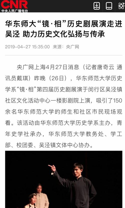 为响应上海团市委“积极引领青年‘往社区走’”的号召,今年, 少妇 “镜·相”第四届历史剧展演首次与吴泾镇文体中心合作,走出校门,走进社区,吸引了当地众多市民前来观剧。通过市民群众喜闻乐见的展演形式,丰富社区文化生活,充分发挥高校服务社会的功能。也让高校青年学子走出校门,走进社区,弘扬中华优秀文化。