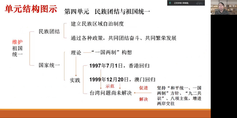 紧随其后,陆瑞琪老师将目光从本课教学转向此课所对应的单元教学,分享了“指向主旨和方法目标单元教学设计”的教研成果。先以八年级中国历史第四册第四单元为例,从单元结构框架图对单元内容主旨做示范性分析。