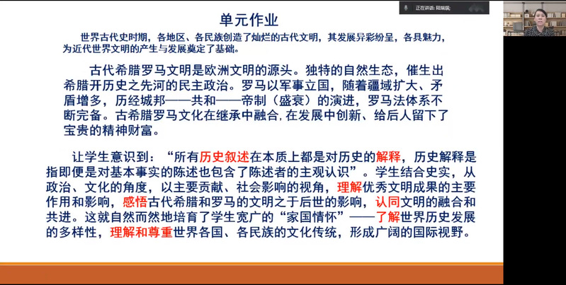 在整个单元的框架结构分析以后,陆老瑞琪老师以中国史第五单元、第六单元以及世界史第二单元至第六单元教学设计为实例,介绍了在单元教学设计下,各课的内容主旨、教学目标、重点难点、教学过程、教学策略、结构板书、作业设计、资料附录八个栏目的设计思路。陆瑞琪老师结合上海市配套初中历史练习册的设计内涵和自己的作业设计对单元作业的设计进行了深入探讨。