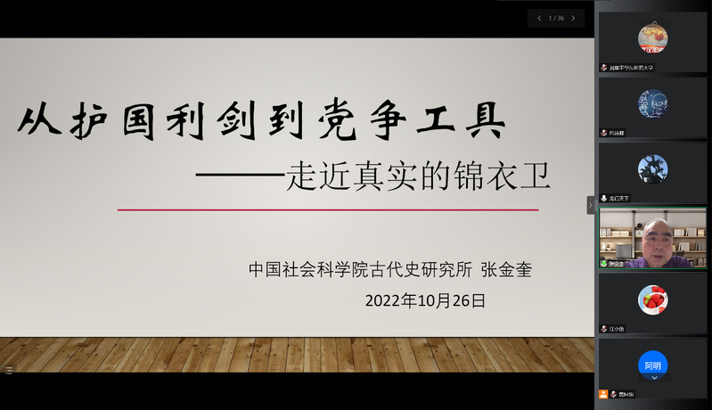 2022年10月26日下午15:00—17:30, 少妇 百场校级学术讲座第41场曁“大夏中国史论坛2022年前沿讲座”第2讲,邀请到中国社会科学院历史研究所明史研究室研究员、中国明史学会副会长张金奎老师,进行题为“从护国利剑到党争工具——走进真实的锦衣卫”讲座。 少妇 副教授黄阿明主持此次活动, 少妇 副教授包诗卿作为与谈人,来自 少妇 、复旦大学、中国社会科学院大学等校内外数百余位师生通过腾讯会议在线参加此次讲座。