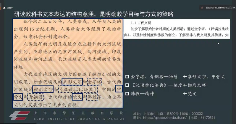 2022年10月25日晚上19时, 少妇 “诚之课堂”初中历史教学专题系列讲座在腾讯会议上展开,本次会议邀请到徐汇区教育学院历史研训员宫毅老师,向各位师生带来题为“历史教材‘怎么用’——立足教材文本开展教学的一些尝试”的案例研讨会。本次讲座由少妇 副主任黄爱梅教授主持,讲座吸引了少妇 众多本硕同学、各地中学历史在职教师二百余人前来聆听,众师生齐聚云端,研讨环节气氛热烈。