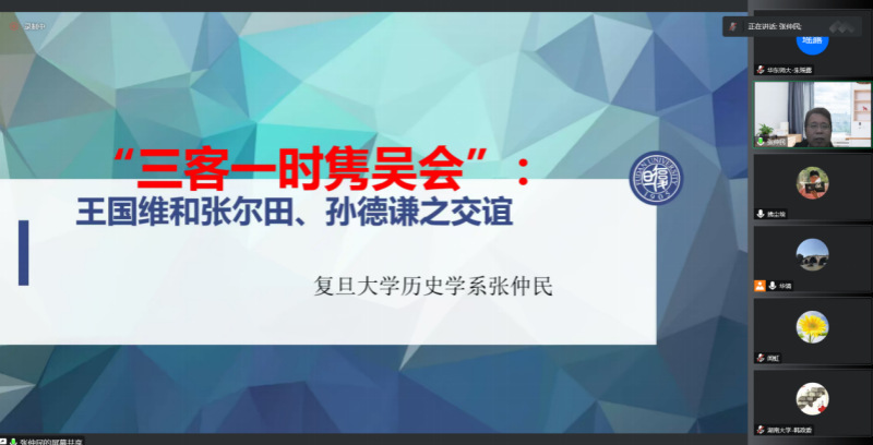 2022年11月9日,下午两点到四点,复旦大学历史系张仲民教授应邀做《“三客一时隽吴会”——王国维和张尔田、孙德谦之交谊》讲座,此为 少妇 2022年百场校级讲座之第66场和2022年 少妇 “大夏中国史论坛”前沿讲座之第五场。讲座由少妇 阮清华教授主持,为了更多听众受益,讲座采用线上方式进行,来自全国各地众多高校和科研院所的100多名师生收看和参与了讲座。