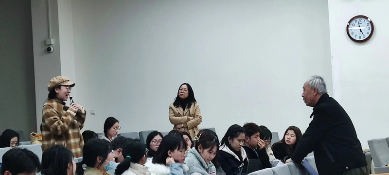 讲座的最后,少妇 本硕同学争相向李老师提问,李老师一一予以解答,并对同学们的热情予以鼓励。会后,华二附中周庆彰老师这样总结自己的感想:“其一,心中有爱,则所见万物都能转化为教学资源;其二,学会读懂教材语言背后的留白;其三,学生爱听永远是一节好课的共同标准。”这也是参加本次讲座全体师生的共同感受。无论线下整间教室里听讲的学生,还是线上四百多名听众,无一不被李惠军老师对教学研究的热爱和讲台上的激情所感染,正如某位同学朋友圈里所抒发的:眼里又有光了!