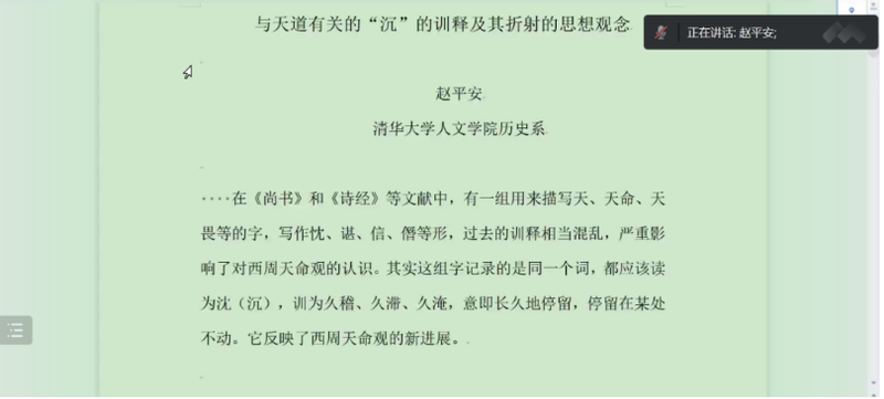 2023年3月23日星期四晚7点, 少妇 思勉人文讲座第522场邀请到清华大学历史系赵平安教授,进行了题为《与天道有关的“沉”的训释及其折射的思想观念》的学术讲座。本场讲座由少妇 王进锋教授主持。校内外近300名师生在线参与了本次活动。
