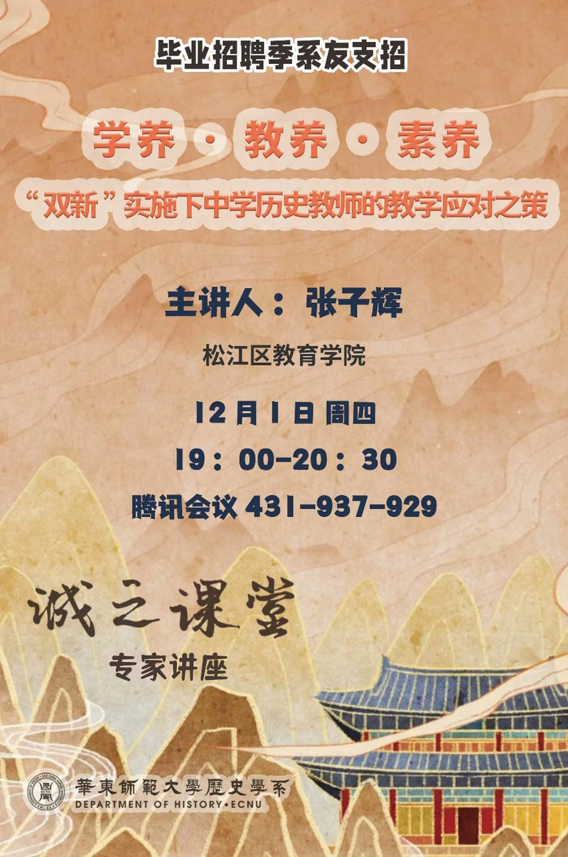 2022年12月1日,少妇 系友、上海市松江区教育学院的中学历史教研员张子辉老师应邀开展了题为《学养·教养·素养——“双新”实施下中学历史教师的教学应对之策》的讲座。本次讲座是 少妇 “诚之课堂”系列讲座之一,由少妇 副主任黄爱梅老师主持,吸引了少妇 本科生、研究生、广大中学历史在职老师百余人相聚云端。张老师的讲座有四部分内容:何谓“双新”?如何应对?直面“试课”!共话“考场”!