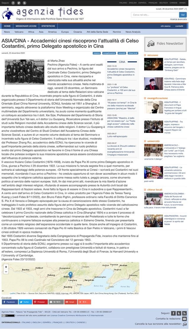 中国天主教“一会一团”、中国意大利研究会以及上海市外办等组织和部门专家线上参加本次讲座。同日,梵蒂冈官媒Fides报道此次学术活动,并称赞其积极意义。