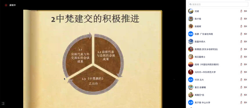 刘国鹏老师最后总结道,尽管今天中梵关系依然在复杂的国际局势中面临着挑战,但2018年9月22日中梵双方就主教任命签订了临时性协议,这是中华人民共和国成立以来中梵关系发展的重要硕果。鉴古方能知今,梳理中梵关系曲折发展的历史有利于我们展望未来。在过去的4年里,中梵双方就“主教任命”问题保持着友好共识,这也让我们看到了未来中梵关系发展的良好前景。