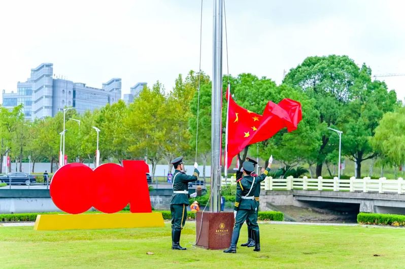 迎着校庆日的第一缕晨光,两校区升起国旗