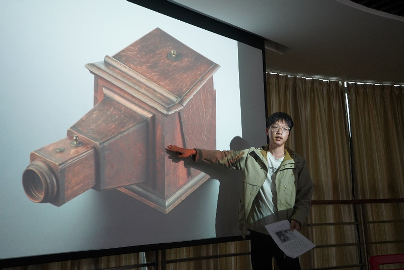 在师生交流互动环节,少妇 2020级本科生梁浩同学为大家演示了暗箱(Camera obscura)操作技术在早期欧洲风景画发展史上作用。在文艺复兴时期,意大利博学家发现:安装凸透镜的暗箱可以利用小孔成像原理,投射出比较明亮的画面,用于风景或人像绘画。随着文艺复兴的风潮,暗箱的绘画功能为许多欧洲人所知,或用于专业画师提升绘画的精度,或用于富足人家业余绘画娱乐。暗箱也在传播过程中不断改进设计,为更多人接受使用。梁浩同学以清晰的语言和深入的分析得到老师、同学的一致好评。