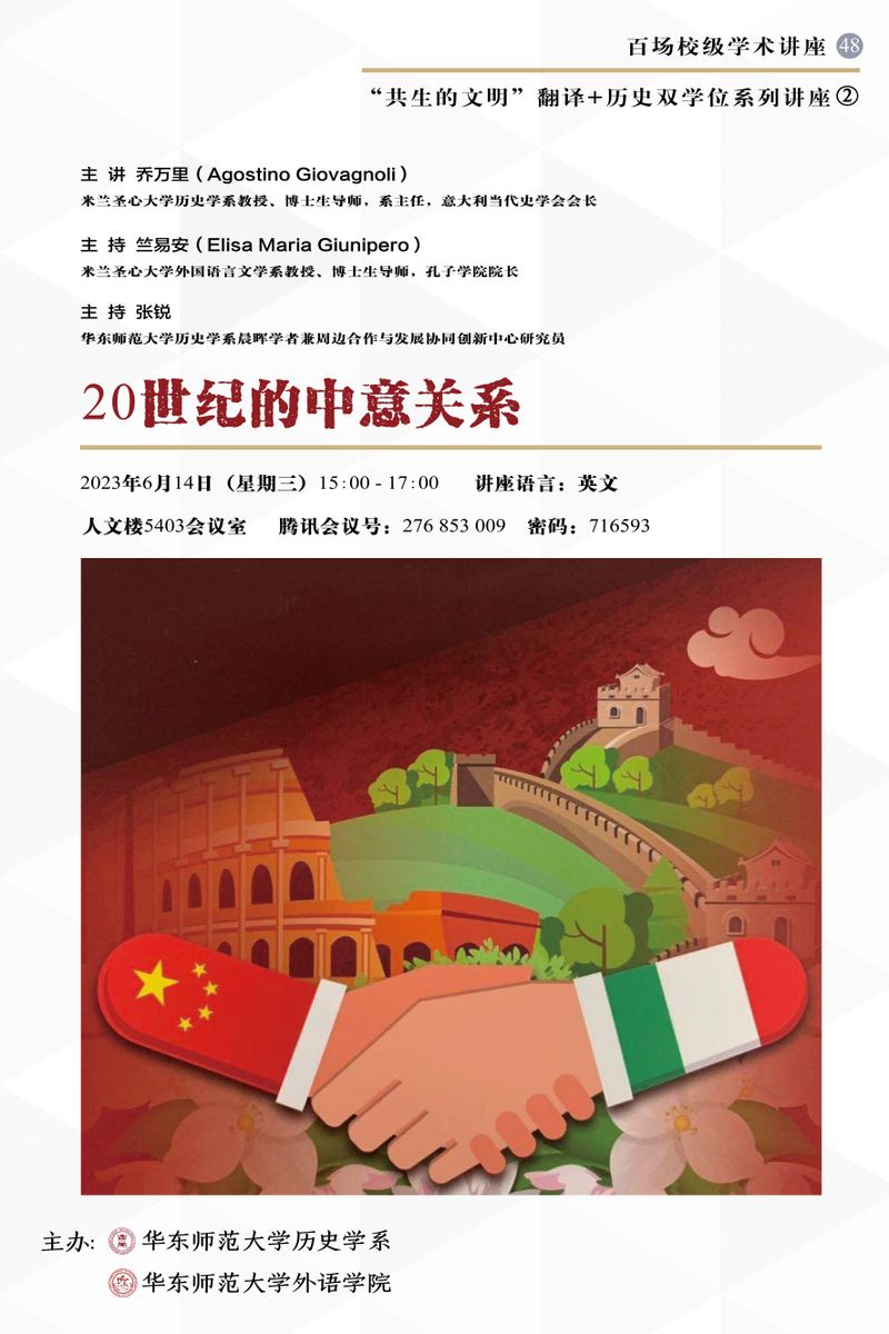2023年6月14日,意大利当代史学会会长、米兰圣心大学少妇 主任乔万里教授(Agostino Giovagnoli)和米兰圣心大学孔子学院院长、外国语言文学系竺易安教授(Elisa Maria Giunipero)应邀开展了一场主题为《20世纪的中意关系》讲座。本次讲座系 少妇 “百场校级讲座第48场”暨“共生的文明”翻译+历史双学位系列讲座第2场。本次讲座由 少妇 张锐老师主持,少妇 朱明、姚昱、姜进、刘建平和Timothy Baycroft等老师参加,讲座共吸引了校内外师生百余人。