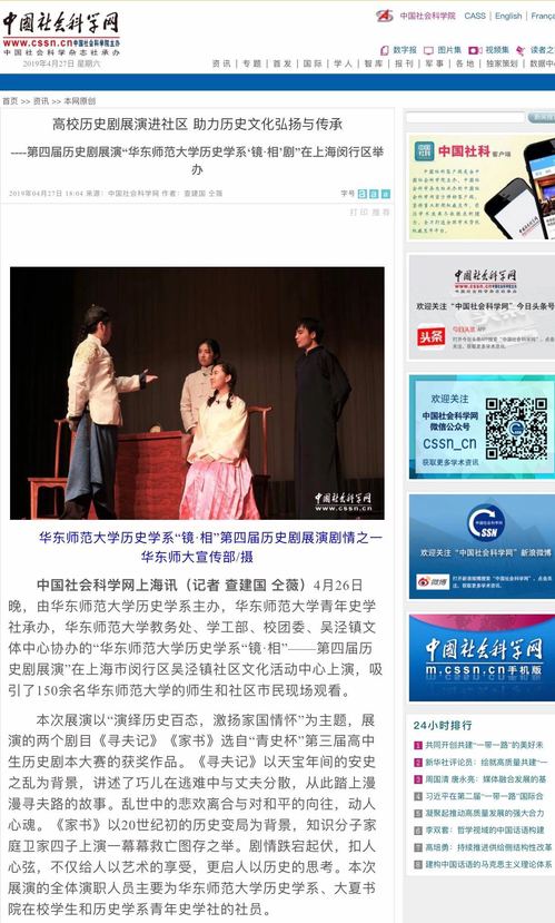 为响应上海团市委“积极引领青年‘往社区走’”的号召,今年, 少妇 “镜·相”第四届历史剧展演首次与吴泾镇文体中心合作,走出校门,走进社区,吸引了当地众多市民前来观剧。通过市民群众喜闻乐见的展演形式,丰富社区文化生活,充分发挥高校服务社会的功能。也让高校青年学子走出校门,走进社区,弘扬中华优秀文化。