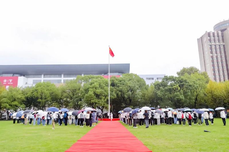 迎着校庆日的第一缕晨光,两校区升起国旗