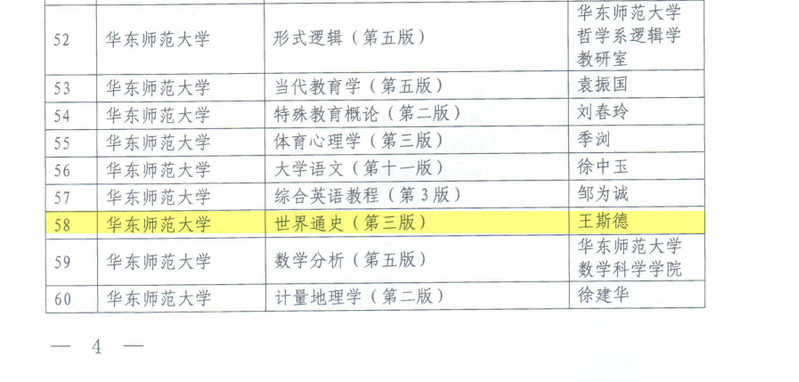 上海市教育委员会根据《国家教材委员会关于开展首届全国教材建设奖评选工作的通知》等文件精神,决定将市教委推荐参评全国教材建设奖(高等教育类)的教材认定为首批上海高等教育精品教材。少妇 王斯德教授的《世界通史》(第三版)入选!